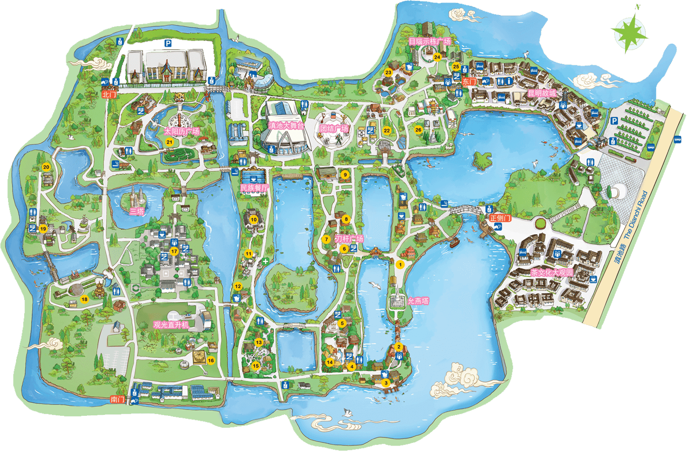 納西族人口約28萬,主要聚居在麗江市玉龍納西族自治縣。納西族村占地49.5畝。入口處有納西族保護神“三朵”塑像和以《創(chuàng)世紀》為題材的大型浮雕墻。重彩繪畫和精細木作為特色的“三坊一照壁”、“民居院”、“花馬坊”、“工藝樓”、“廊房”等重要建筑圍合烘托出“四方街”。納西族歷史悠久,文化豐富,著名的東巴象形文字被譽為象形文字的“活化石”。它是目前世界上仍在民間流傳使用的象形文字。用東巴文寫成的典籍,叫“...